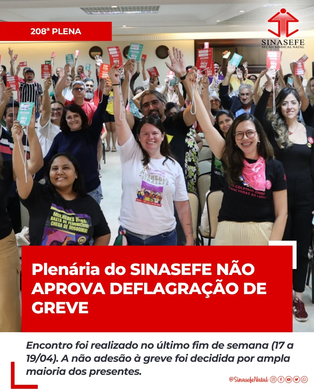 O SINASEFE realizou no último fim de semana (17 a 19/04), a 208ª Plenária Nacional. A principal pauta do encontro foi a deliberação sobre a possibilidade de greve na educação federal. Por ampla maioria, a plenária decidiu não deflagrar greve neste momento.