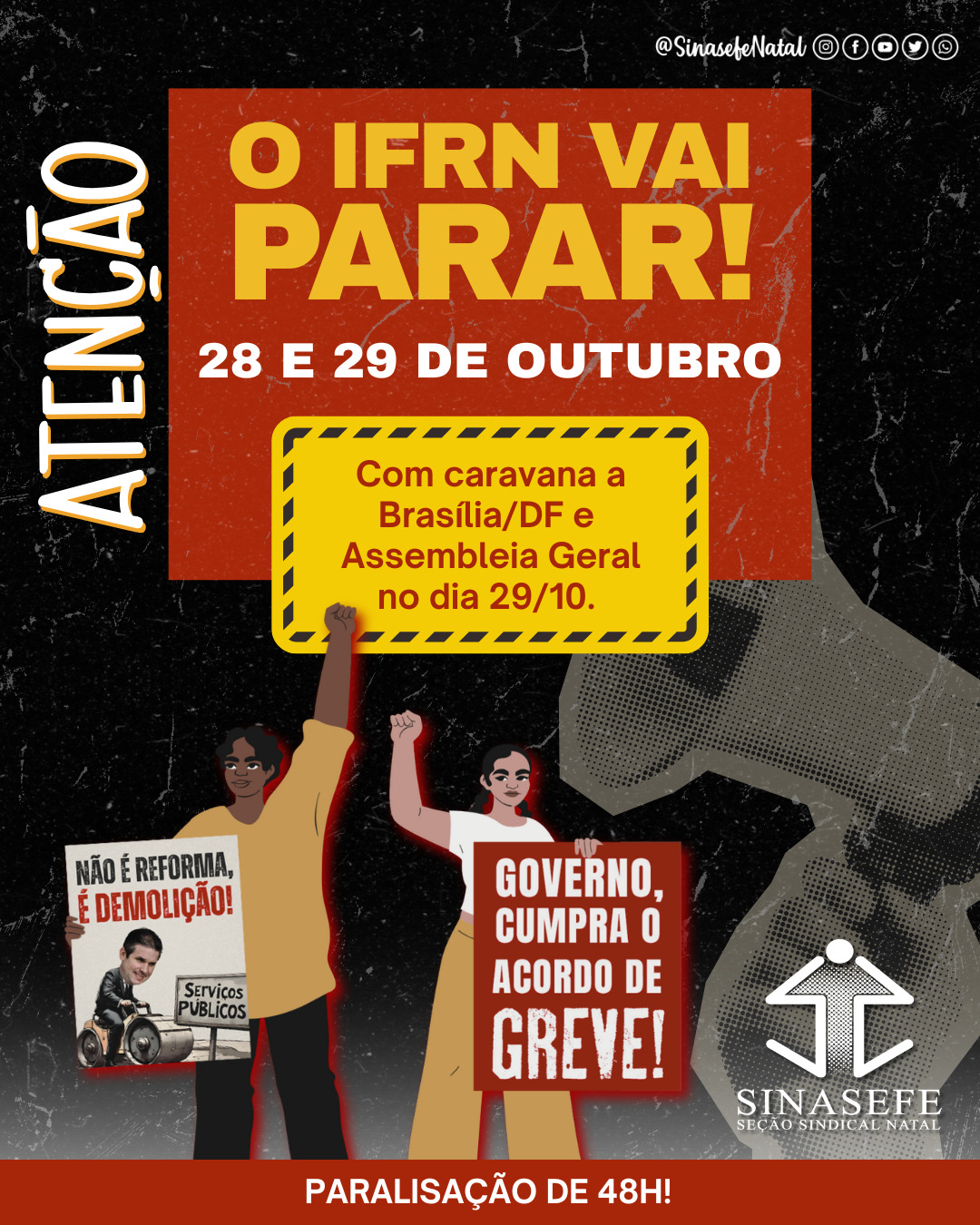 O SINASEFE Seção Natal convoca a categoria a participar da Paralisação Nacional da Educação Federal nos dias 28 e 29 de outubro, que tem como objetivo denunciar a Reforma Administrativa e exigir o cumprimento total dos acordos da Greve de 2024.