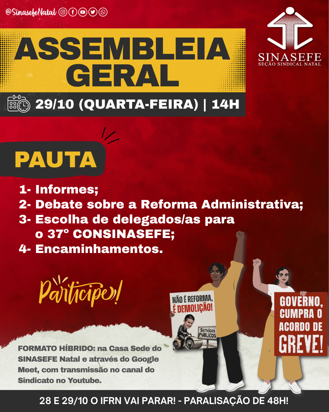 A Assembleia acontecerá às 14h, no formato híbrido: presencial na Casa Sede do SINASEFE Natal e através do Google Meet (https://meet.google.com/tpo-ppwa-wem – servidores devem acessar a sala do Meet com o e-mail escolar). O encontro também será transmitido pelo canal do SINASEFE Natal no Youtube (https://www.youtube.com/watch?v=tmWn_et5YwY).