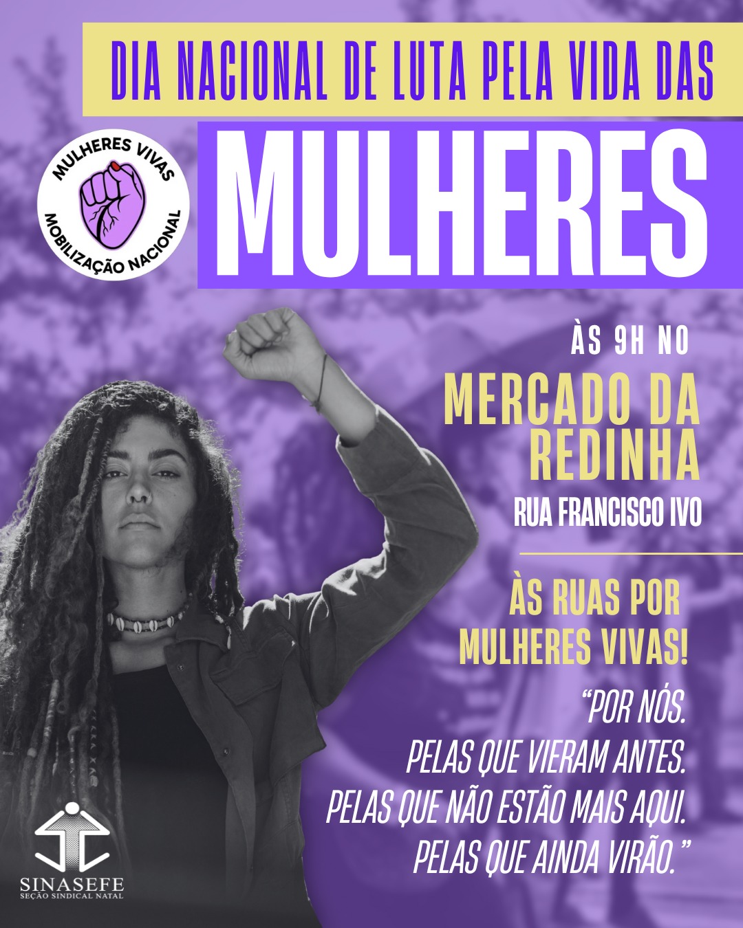 O SINASEFE Natal reforça o convite e destaca a importância da participação de todas e todos. Vamos ocupar as ruas, fortalecer essa luta e afirmar: queremos as mulheres vivas!