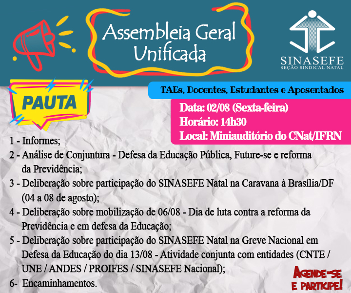 O SINASEFE Seção Natal convida os Técnico-Administrativos, Docentes, Estudantes e Aposentados do IFRN para participar na próxima sexta-feira (02/08) da Assembleia Geral Unificada, que acontece às 14h30, no Miniauditório do IFRN Campus Natal-Central, localizado no Bloco B.