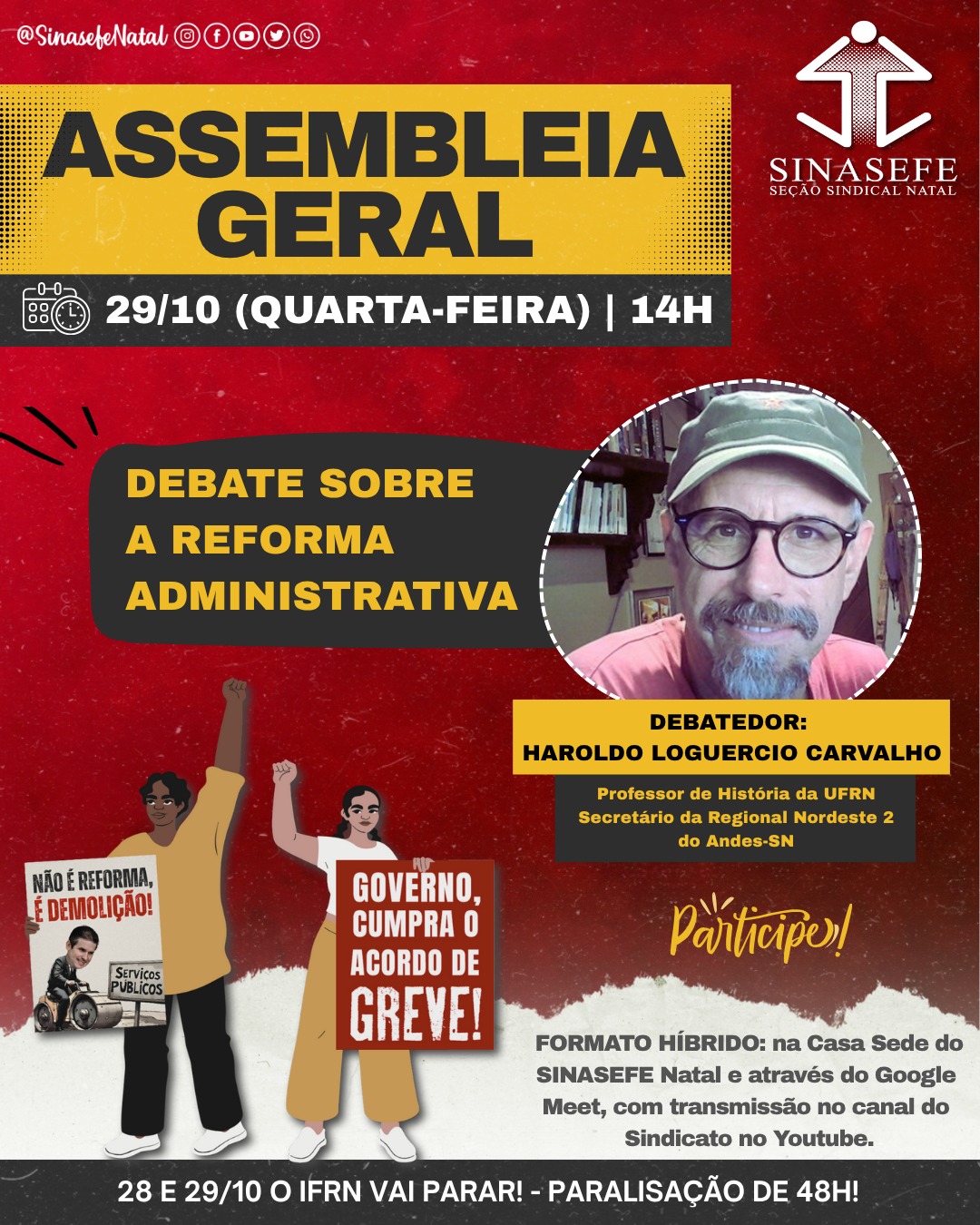 O SINASEFE Seção Natal realiza nesta quarta-feira (29/10), uma Assembleia Geral Híbrida que vai debater sobre a Reforma Administrativa e tem como convidado Haroldo Loguercio Carvalho, professor de História da UFRN e secretário da Regional Nordeste 2 do Andes-SN, que vai abordar os aspectos gerais da reforma e fazer considerações sobre o que pode ocorrer com os servidores públicos federais caso a proposta seja aprovada.