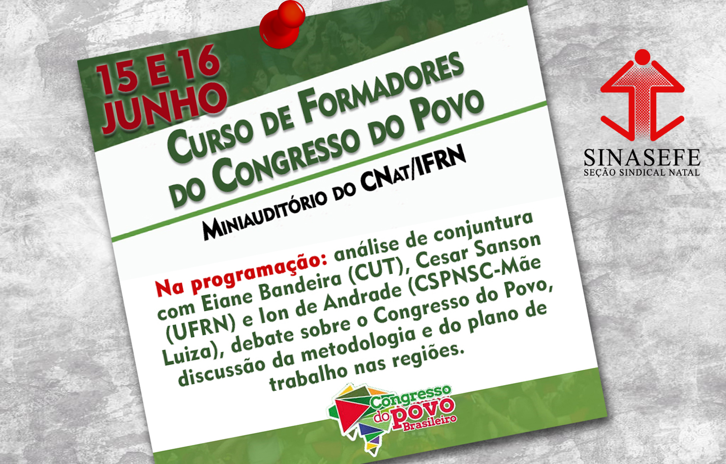 A Frente Brasil Popular promove nos próximos dias 15 e 16 de junho (sexta-feira e sábado) o Curso Estadual de Formadores do Congresso do Povo. A atividade será realizada no Miniauditório do IFRN Campus Natal-Central e deverá reunir lideranças de todos os municípios do estado que terão como missão retornar às suas cidades e dar o pontapé na preparação do Congresso em seus territórios.
