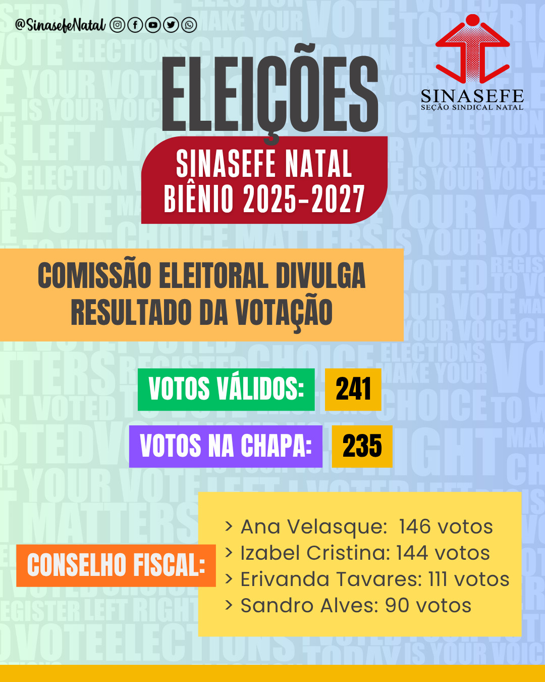 > Confira todas as notícias divulgadas sobre as eleições do SINASEFE Natal biênio 2025-2027: https://www.sinasefern.org.br/cat/eleicoes-2025-2027/