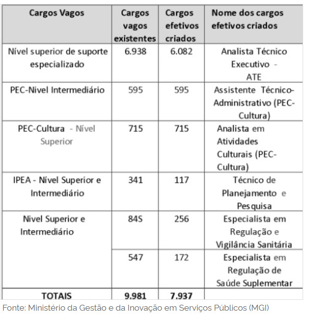 O PL transforma 9.981 cargos vagos existentes em 7.937 cargos, a maior parte nessa nova carreira transversal, adaptada às novas demandas do Estado brasileiro.