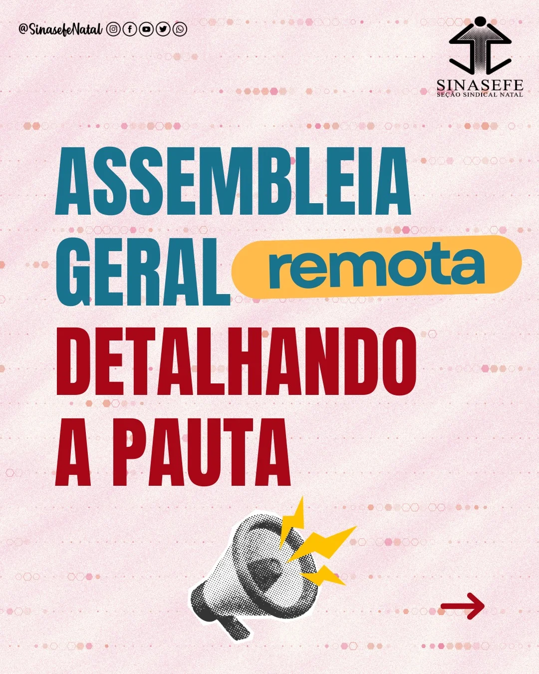 O SINASEFE Seção Natal realizará na próxima terça-feira, dia 17 de março, uma ASSEMBLEIA GERAL REMOTA. Confira a pauta detalhada: 1- Informes - Repasses de informações de interesse e relevância para a categoria; 2- Análise