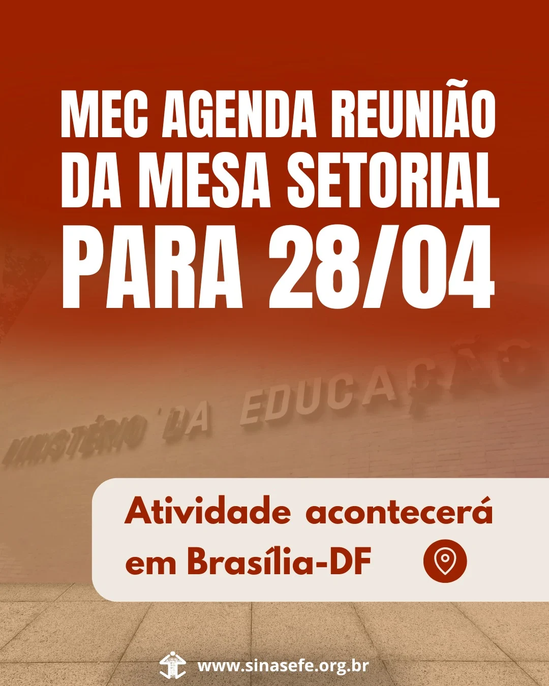 O Ministério da Educação (MEC) remarcou para 28 de abril (terça-feira), às 10 horas, a 1ª Reunião Ordinária da Mesa Setorial de Negociação Permanente (MSNP), que acontecerá na sede do MEC, em Brasília-DF. Inicialmente a reunião estava marcada para 14/04.