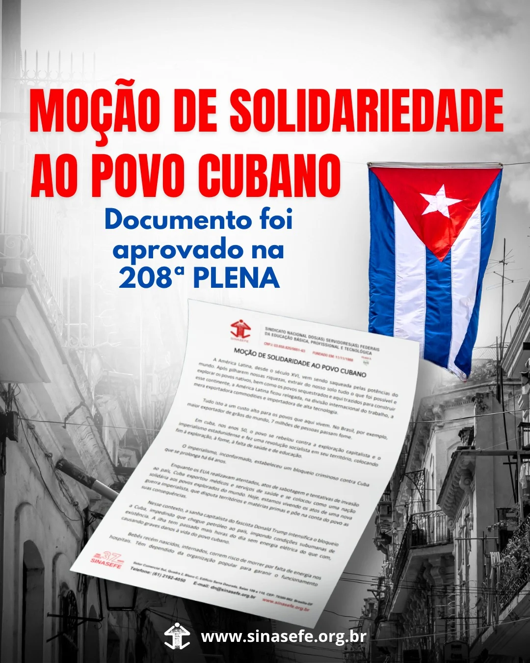 Nós, trabalhadoras e trabalhadores da educação federal, reunidos na 208ª Plenária Nacional do SINASEFE, no dia em que se celebra a primeira derrota do exército estadunidense na América Latina – a vitória cubana em Playa Girón –, compreendemos a importância de nos posicionar do lado certo da história, contra o imperialismo e em solidariedade ao povo cubano e a todos os povos do mundo, que sofrem pela ganância e violência capitalista.