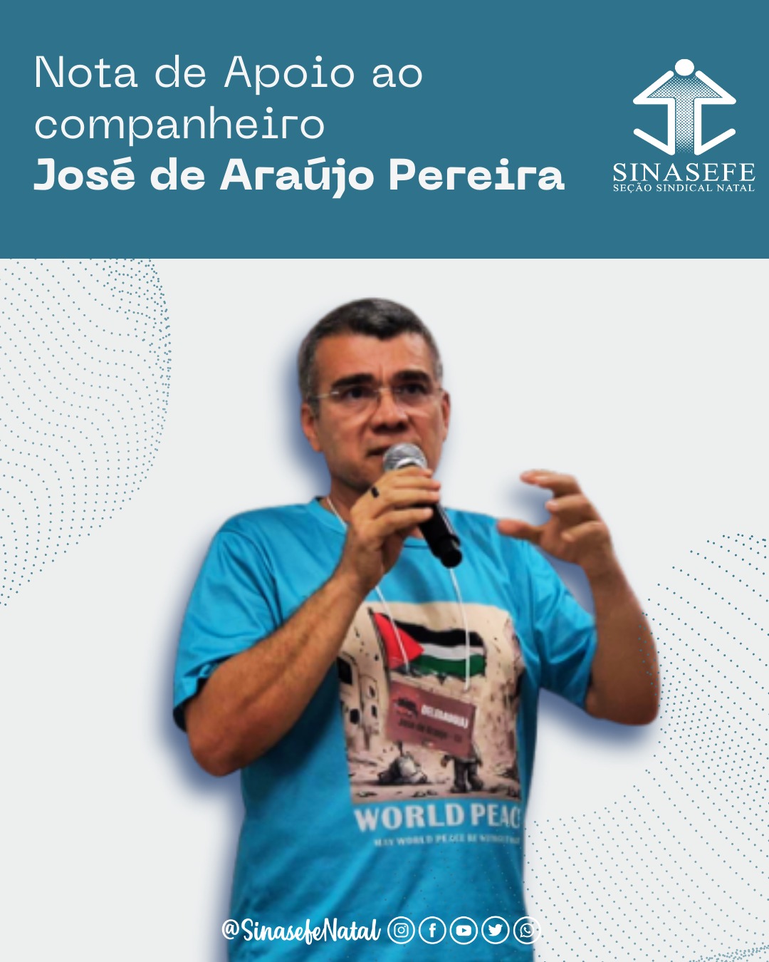A Diretoria Executiva do SINASEFE Seção Natal manifesta sua solidariedade ao coordenador do Sindicato dos Trabalhadores Federais da Educação Básica, Profissional e Tecnológica da Paraíba (SINTEF-PB), José de Araújo Pereira, diante da ação judicial movida contra ele pelo deputado federal Hugo Motta (Republicanos-PB).