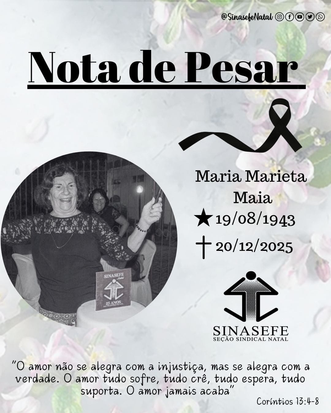Nossos sentimentos e solidariedade à família, ao seu filho, Daniel, aos amigos e a todos que compartilham a memória de Marieta. O SINASEFE Natal se coloca à disposição de seus familiares para qualquer apoio necessário.
