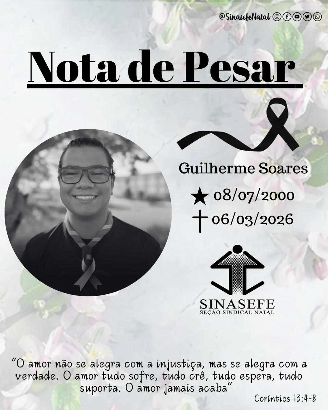 Nesse momento de dor e luto, prestamos nossos sentimentos e solidariedade ao servidor aposentado Ednaldo Pereira, aos seus familiares, aos amigos e a todos que compartilham a memória de Guilherme. O SINASEFE Natal se coloca à disposição da família para qualquer apoio que se fizer necessário.