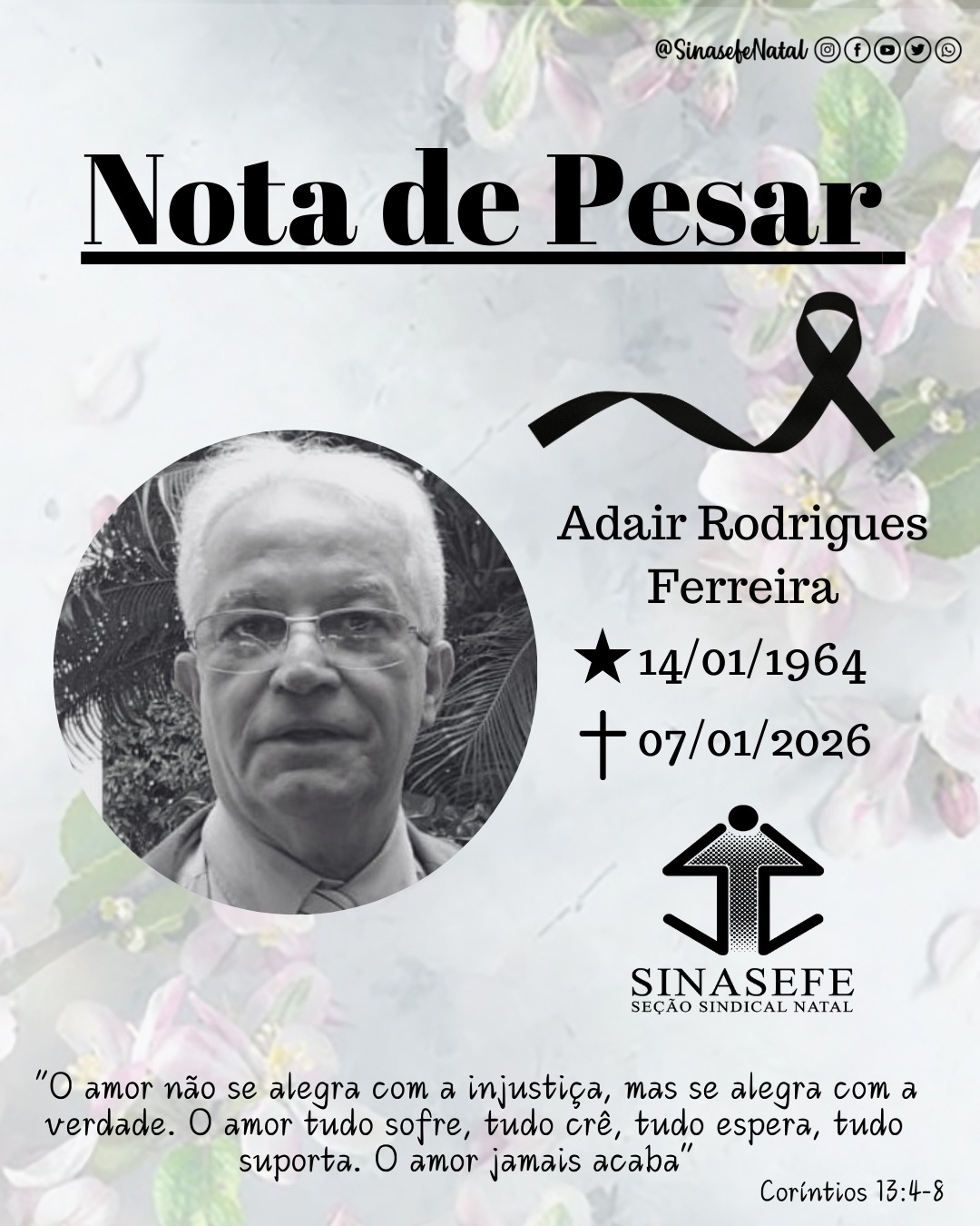 O SINASEFE Seção Natal manifesta seu profundo pesar pelo falecimento do servidor aposentado Adair Rodrigues Ferreira, ocorrido ontem (07/01), em Maringá-PR.