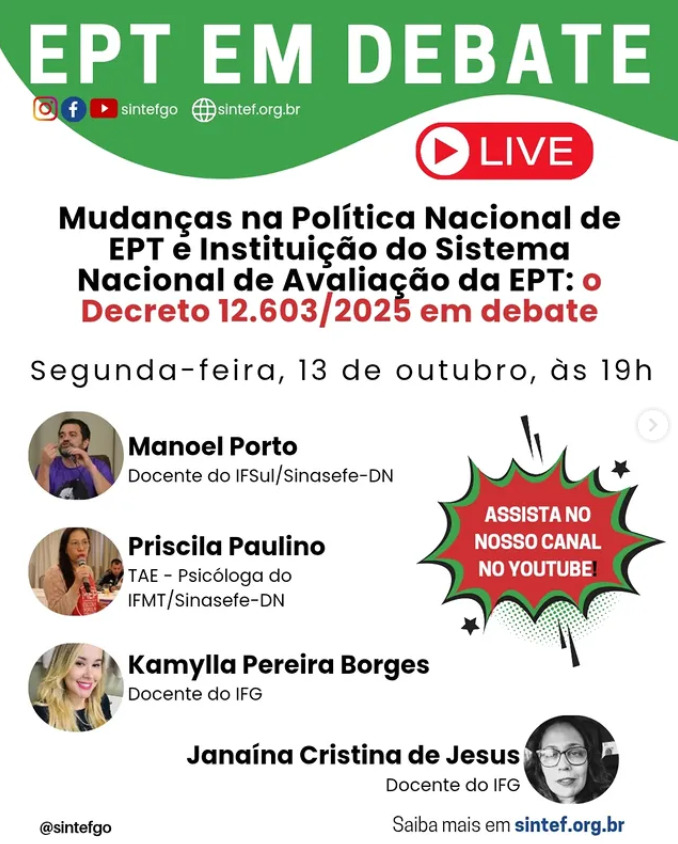 O Sintef-GO, em parceria com a Direção Nacional do SINASEFE, realizará na próxima segunda-feira (13/10), às 19h, uma transmissão ao vivo sobre do Decreto nº 12.603, de 28/08/2025. O decreto instituiu a Política Nacional de Educação Profissional e Tecnológica (PNEPT), articulada ao PNE, e regulamentou o artigo 4° da Lei n° 14.645/2023, instituindo o Sistema Nacional de Avaliação da EPT. A live será transmitida no Canal do YouTube do Sintef-GO:
