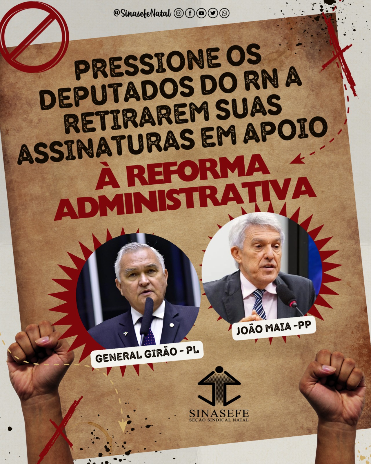O SINASEFE Seção Natal convoca a sua base para se mobilizar contra a Reforma Administrativa, que ameaça os serviços públicos e os direitos das servidoras e dos servidores. Participe dessa luta e pressione os deputados federais João Maia (PP/RN) e General Girão (PL/RN) para retirem suas assinaturas de apoio a esse projeto que ataca o funcionalismo e a população brasileira.