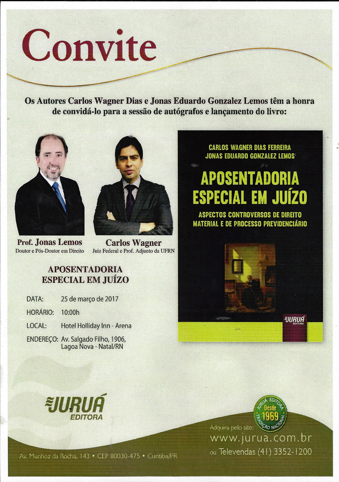 O Professor do IFRN Jonas Eduardo Gonzalez Lemos e o Juiz Federal Carlos Wagner Dias Ferreira lançarão no próximo sábado (25 de março) o livro “Aposentadoria especial em Juízo”. A obra traz os aspectos práticos do direito previdenciário e do processo previdenciário sobre o benefício da aposentadoria especial.