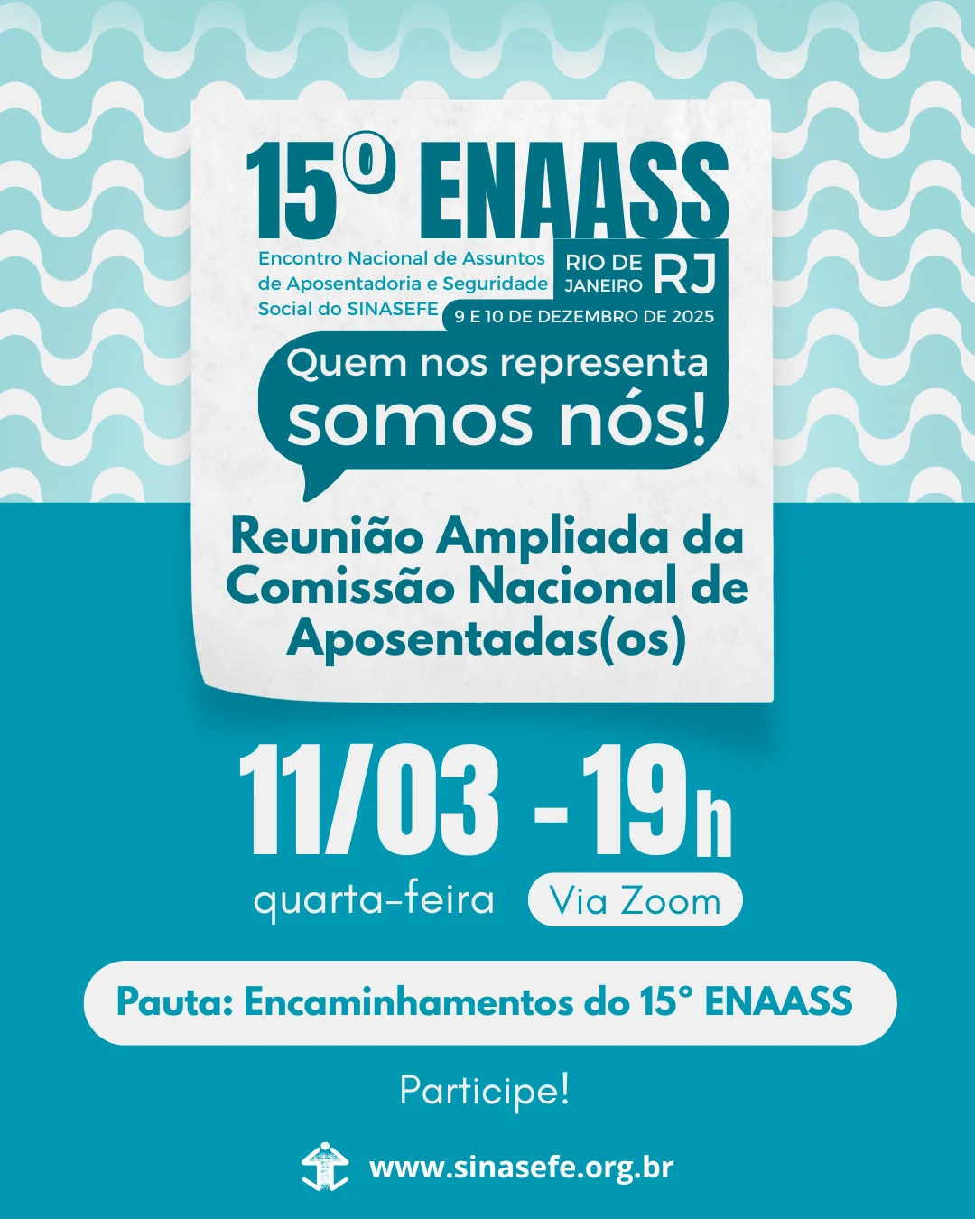 Atenção aposentadas(os), aposentandas(os) e pensionistas filiados ao SINASEFE, em especial às/aos que participaram do 15º Encontro Nacional de Assuntos de Aposentadoria e Seguridade Social (ENAASS): a Comissão Nacional de Aposentadas(os) do nosso sindicato quer ouvir vocês!