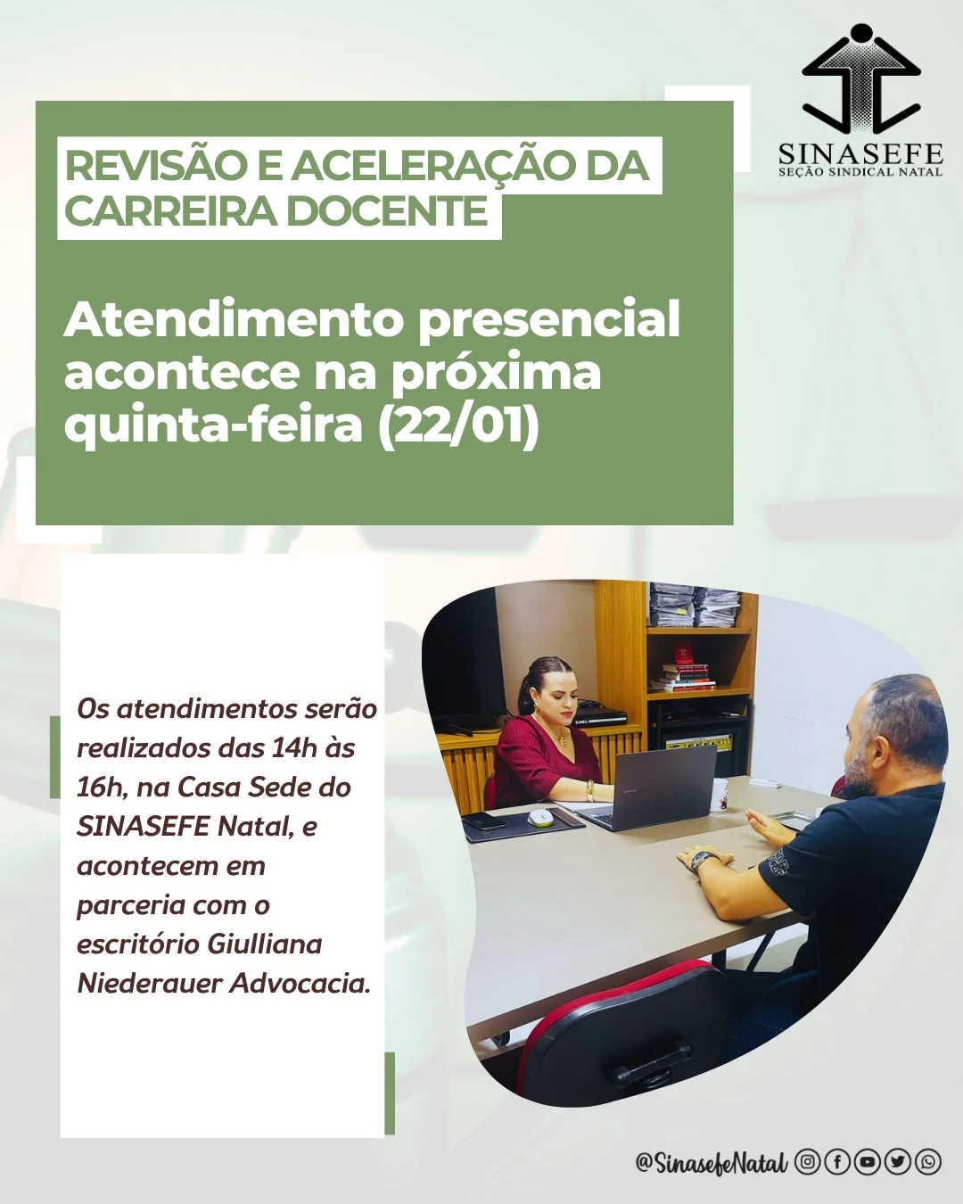 O SINASEFE Seção Natal segue realizando atendimentos às servidoras e aos servidores docentes interessados em impetrar ação judicial individual para a correção da progressão funcional na carreira de Professor(a) EBTT. Na próxima semana, a advogada Giulliana Niederauer realizará atendimento presencial na quinta-feira (22/01), das 14h às 16h, na Casa Sede do SINASEFE Natal.