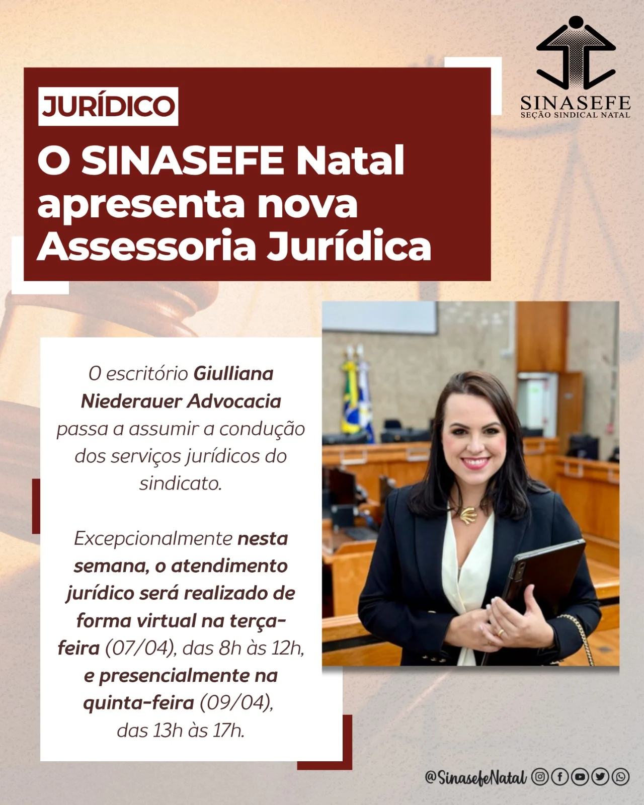 O SINASEFE Natal comunica à categoria que o sindicato está com nova assessoria jurídica. Após um período de importante parceria, o escritório Gondim, Marques, Cavalcanti e Garcia Advogados Associados encerra sua atuação junto à seção, sendo sucedido pela Giulliana Niederauer Advocacia, que passa a assumir a condução dos serviços jurídicos.