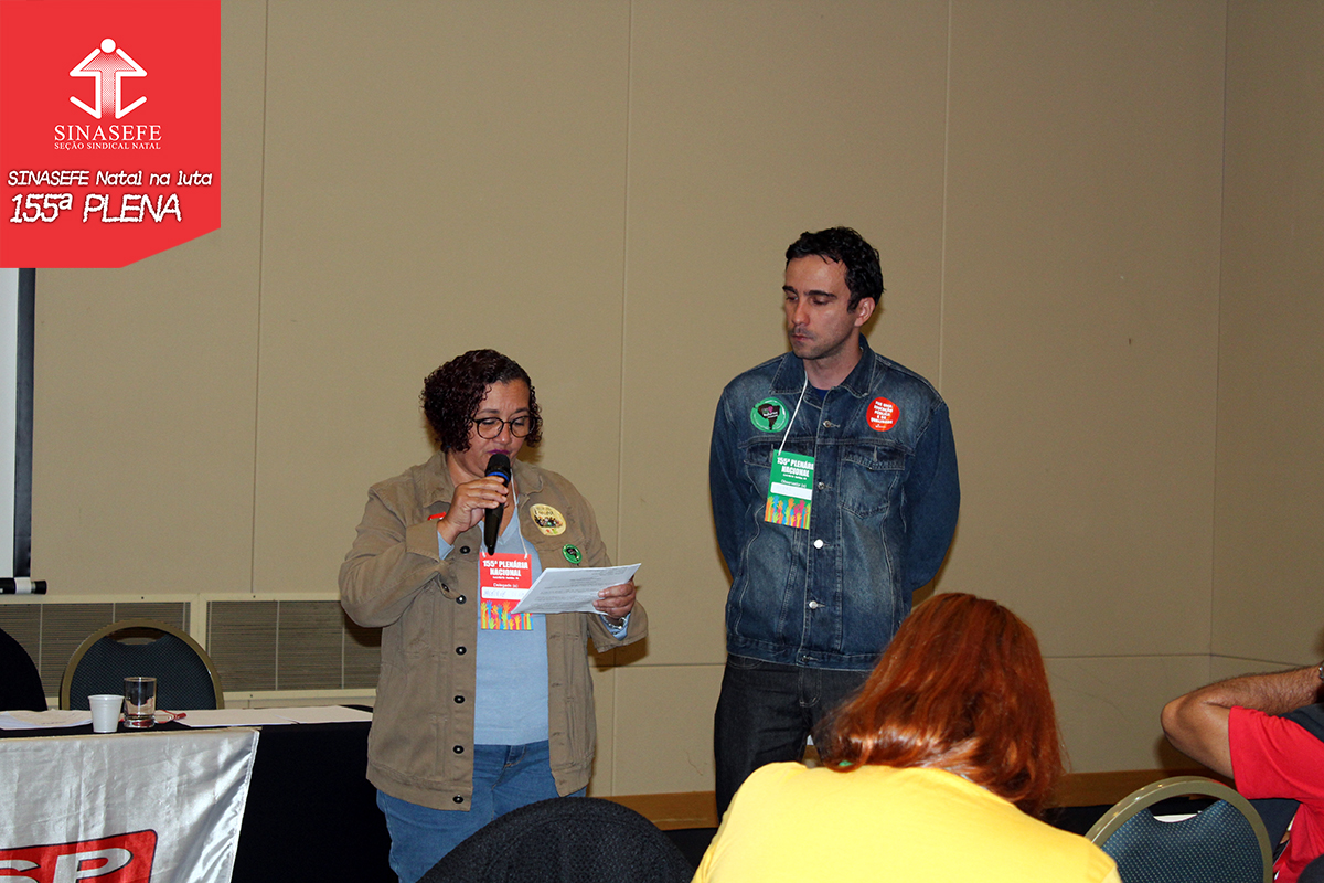 Ainda no segundo dia de debates, a Plenária ainda aprovou, sem votos contrários, as resoluções do I Encontro de Comunicação do SINASEFE (ECOS). A 155ª aconteceu no Grand Hotel Rayon e contou com a participação de 72 delegados e 89 observadores, representando 41 Seções Sindicais. Participaram pela Seção Natal, os dirigentes, Aurir Marcelino, André Palhares e Monique Oliveira, pela base estiveram presentes no encontro, o servidor do Campus do IFRN Ceará Mirim, Ricardo Vilar, o membro do Conselho Fiscal do SINASEFE, Valmir Lucena e o servidor Jário Castro do Campus do IFRN Canguaretama.